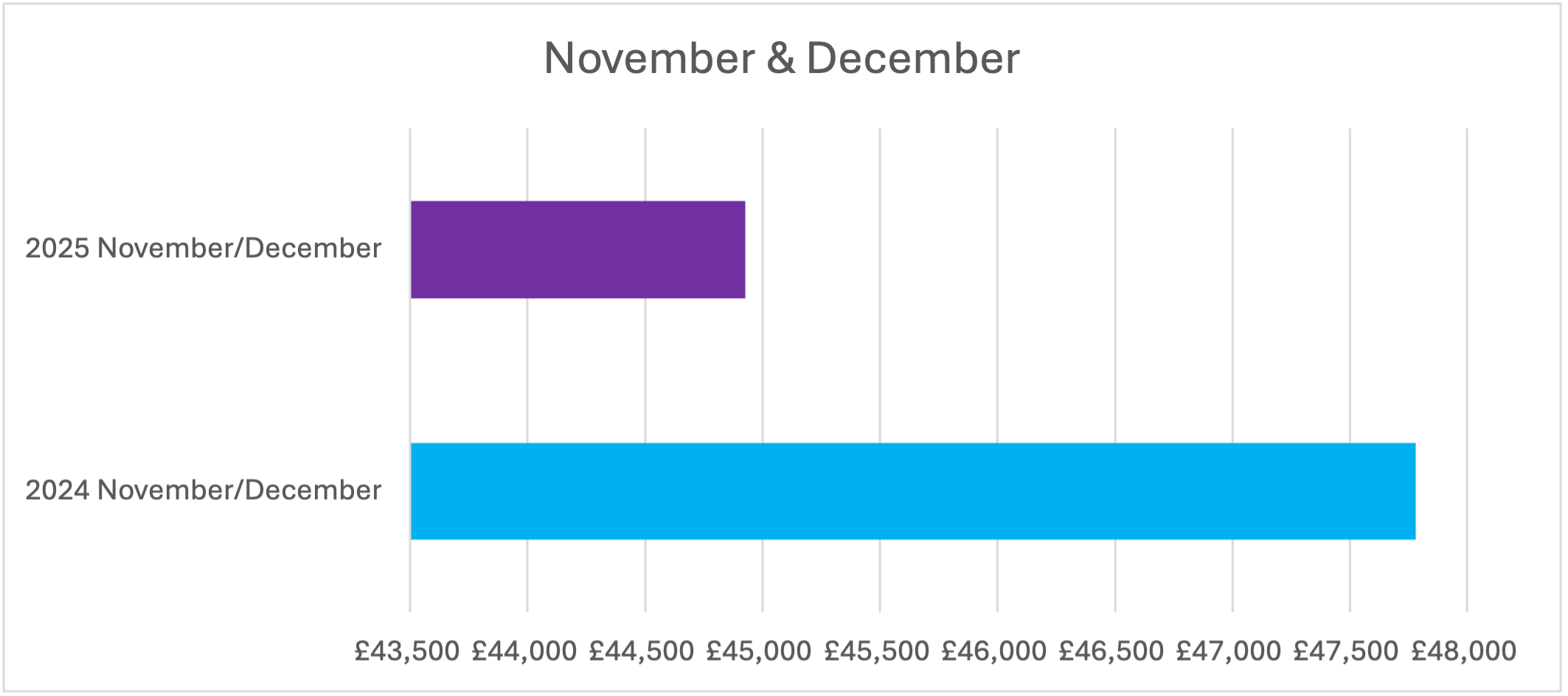 2025 November/December saw a £2,852 decrease in sales in comparison to 2024 November/December sales. Overall, sales were still at an all-time high hitting a result of £44,928 for the end of the year.